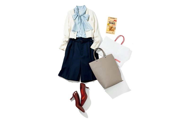 ショートパンツ¥26,400/ドレスレイブ(ジオン商事) ニットポロアンサンブル(カーディガン)¥3,990/GU ボウタイブラウス¥16,500/ストロベリーフィールズ(シュガー・マトリックス) ブラウンパンプス¥19,250/ダイアナ(ダイアナ 銀座本店) トートバッグ¥13,000/PLST ゼロ シュガーフリービスケット〈バター〉オープン価格/ロッテ