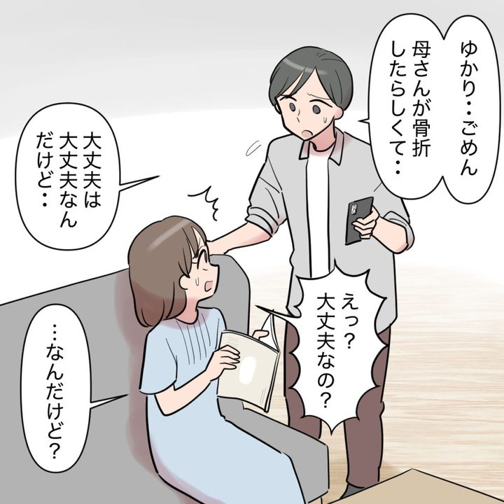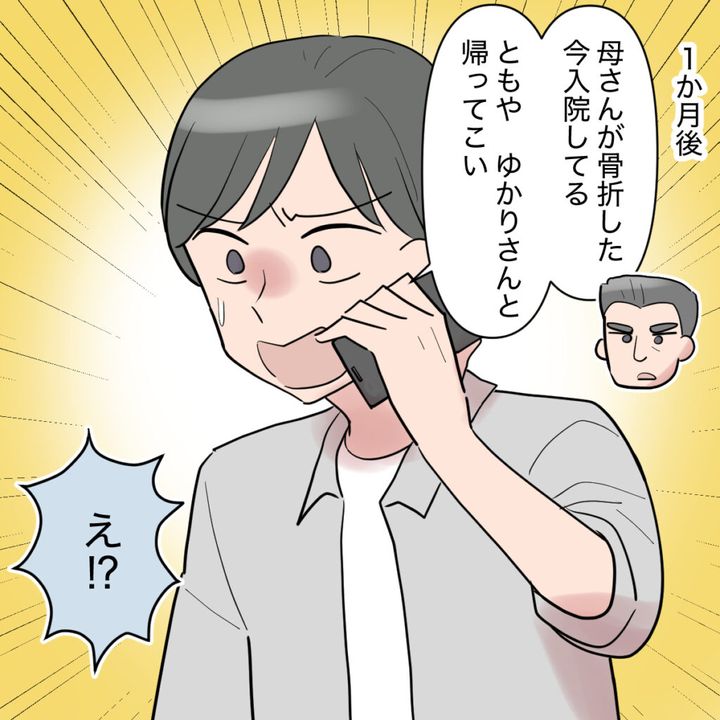 挨拶から1ヶ月後、義父からともやに電話がかかってきました。「母さんが骨折した。今入院してる。ともや、ゆかりさんと帰ってこい」と言われ、ともやは驚きます。