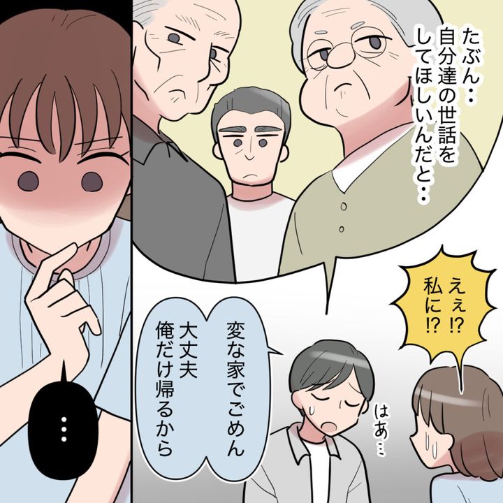 「たぶん・・自分たちの世話をして欲しいんだと‥」と溜息まじりに言うともや。「えぇ!?私に!?」驚く私にともやは「変な家でごめん。大丈夫、俺だけ帰るから」と申し訳なさそうに言いました。義祖父母は、義母が入院している間の家のことを私にやらせようとしているようです。きっと義父は義祖父母に言われてともやに電話をしてきたのだと思います。私はしばらく考えました。