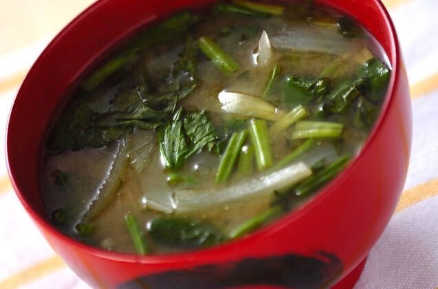 1、鍋にだし汁を入れて中火にかけ、煮たったら玉ネギを加えて1~2分煮る。ホウレン草を加えてみそを溶き入れ、器に注ぐ。