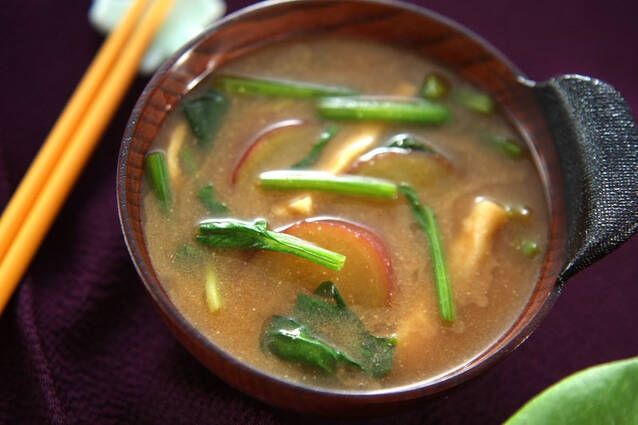 鉄分豊富なホウレン草と食物繊維たっぷりのサツマイモを合わせたみそ汁。食べ応があり、美肌に導いてくれそうですね。小腹が空いた時にもどうぞ。