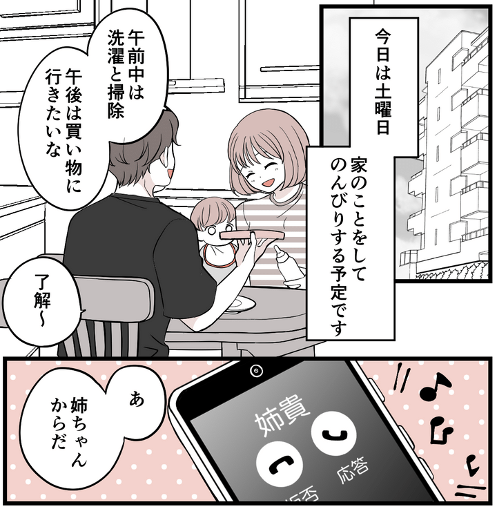 私はミサキ(28)。旦那のアツシ(28)とセイ(5か月)の3人暮らしです。近くには義実家があり、徒歩15分の距離。同じく15分くらいの距離のところに義姉・ヒサエ(31)さんが住んでいます。月に一度ほど義実家で食事に呼んでもらっています。お互いの子どものイベントごとには義実家で会うのですが、義姉とは個人的にお付き合いをするほど仲よくはありません。育休をとっている私と旦那は、今日はお休み。家でのんびりしながら家事をする予定でした。