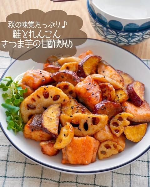 鮭の旨みとれんこんのシャキッと感、そしてさつまいもの甘さを1つにしたのは@chouchou.kitchenさんの「鮭とれんこんとさつま芋の甘酢炒め」。