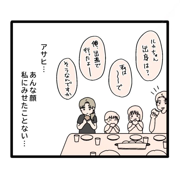 「ルカちゃん、出身は?」「私は・・・で」「俺、出張で行ったよー」「そうなんですか」とパンを囲んで和気あいあいムードに包まれるなか、ユキさんは、「アサヒ・・あんな顔、私に見せたことない・・」と心の中で呟いていました。
