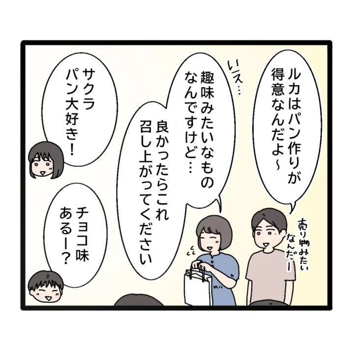 すると、「ルカはパン作りが得意なんだよ~。売り物みたいなんだー」ユウトさんがそう言うと、「いえ・・趣味みたいなものなんですけど・・良かったらこれ召し上がってください」そう言って、紙袋を差し出しました。