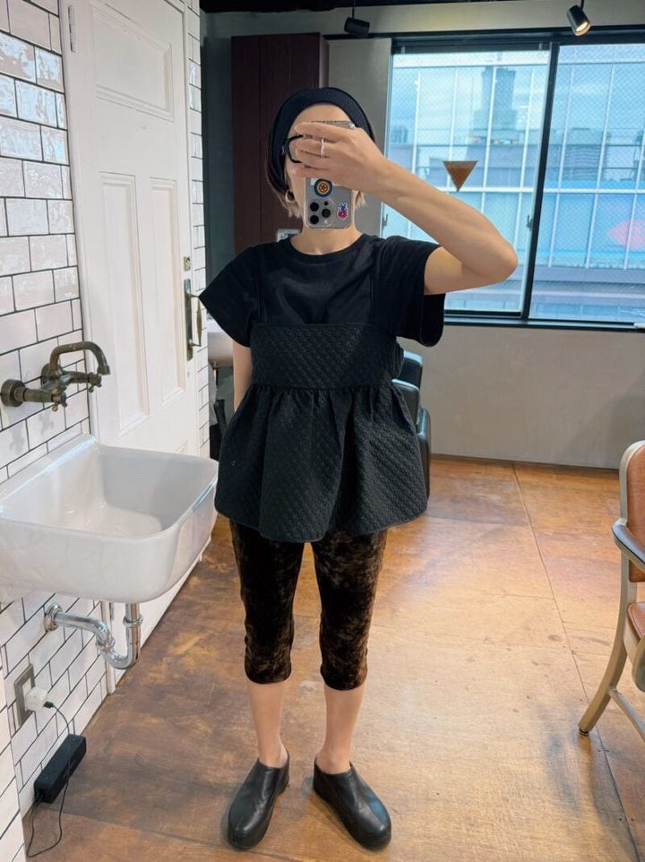 全身をダークトーンで統一した、シックな着こなし。ビスチェやレギンスなど、旬のアイテムを取り入れて、今年らしくまとめています。丈感が絶妙なレギンスには、フレアシルエットのビスチェが相性抜群! シューズは黒のサボをチョイスして、感度高めに仕上げています。