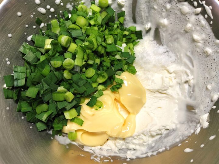 3. 塩、砂糖、マヨネーズ、ニラを加えて混ぜます。
