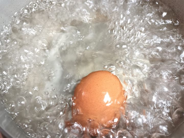 1. まず半熟卵を作ります。沸騰したお湯(分量外)に卵を入れて8分茹でてから、冷水(分量外)で冷やします。