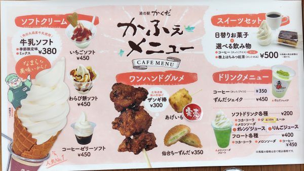 今回は満腹で断念しましたが、次回は角田丸森産牛乳を使用した牛乳ソフトクリーム、日替わりお菓子+飲み物のワンコインスイーツセット(500円)、仙台ちーずんだ(350円)などのワンハンドグルメを狙いたいと思いました。