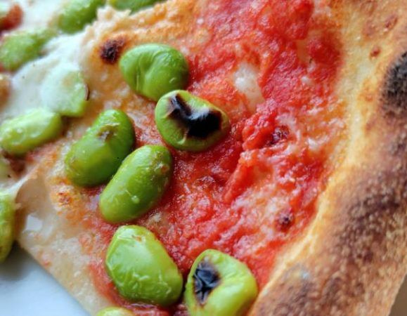 秘伝豆の緑とソースのコントラストの鮮やかさや、こんがりとした焼き目が食欲を刺激します。 一口食べると、生地の香ばしさにびっくり。外はカリカリ、サクサク。中はもちもち。ふわふわピザが苦手な私好みでした。 トマトの酸味が秘伝豆のほっくりとした甘さを引き立てます。口の中で秘伝豆がぷちっと弾ける食感が楽しい。噛むほどに優しい甘みが広がります。