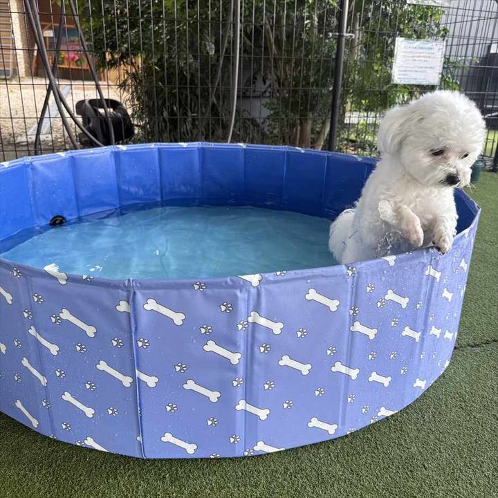 こちらは、マルチーズとビションフリーゼのミックス『ほたて』ちゃん。 プールに初めて入ったそうですが、縁におててをかけて、うつむき気味になっていました。