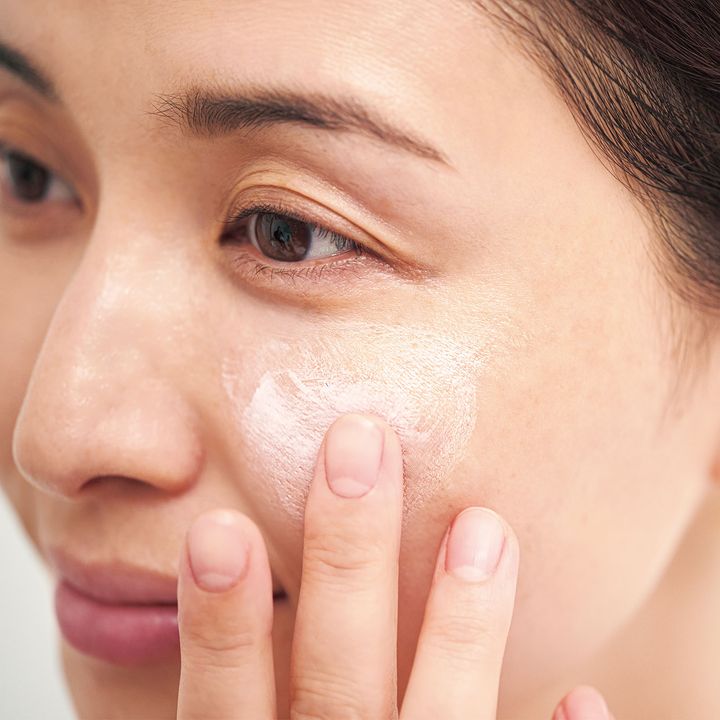 こめかみから耳上、もみあげ中央から頰骨のライン、耳下から顎先、さらに眉頭下のくぼみと下唇の下中央にのせ、外に向かって指でぼかします。