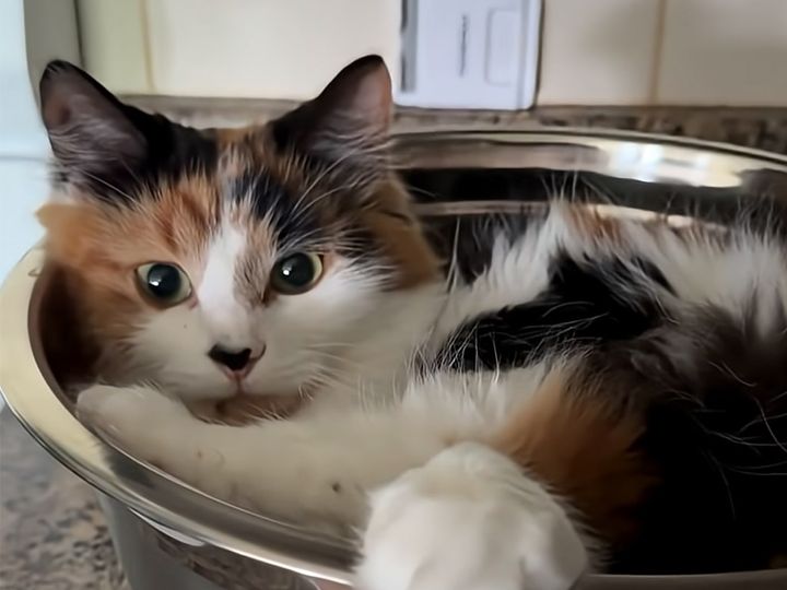 狭いボウルの中で体をねじる猫さん、飼い主の「〇〇みたい」発言がぴったり