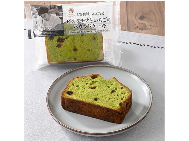 安食雄二シェフ監修商品です。ピスタチオの風味が香るパウンドケーキです。フリーズドライのいちごの酸味が、味のアクセントになっています。ナッツ系の味わいを強調するために、アーモンドプードルも生地に加えました。