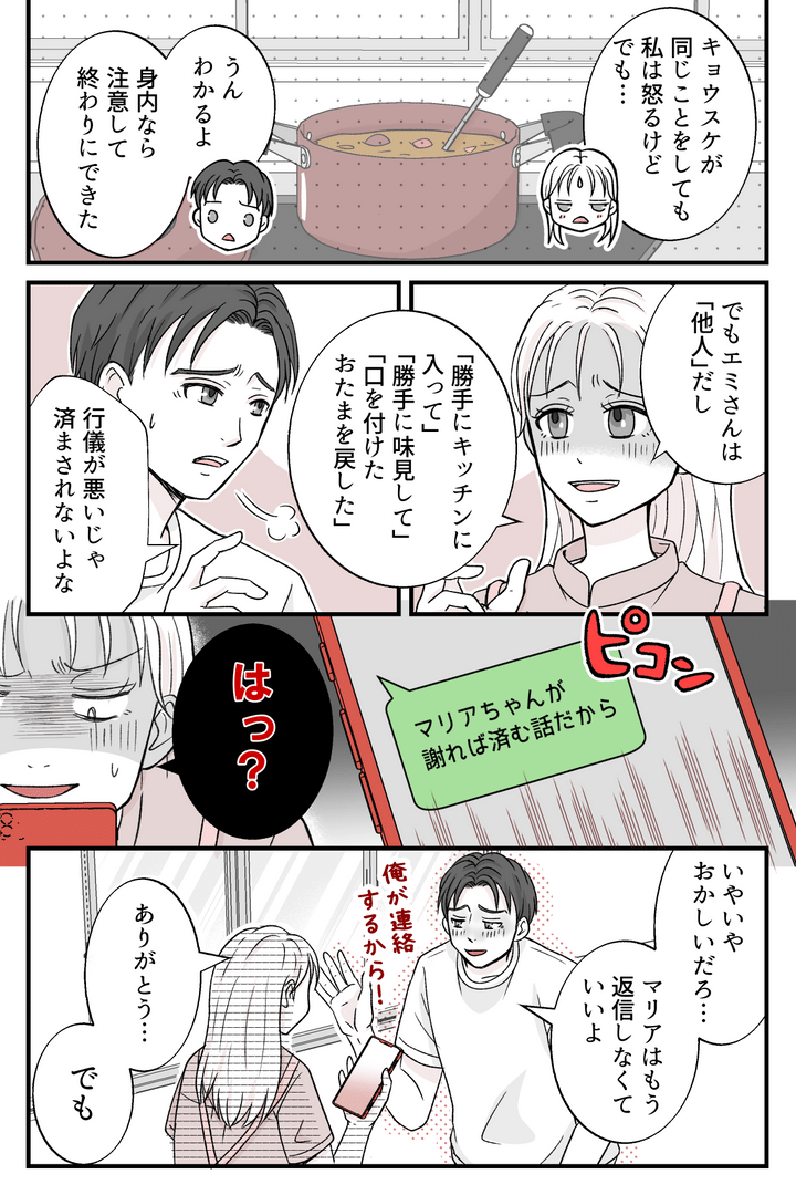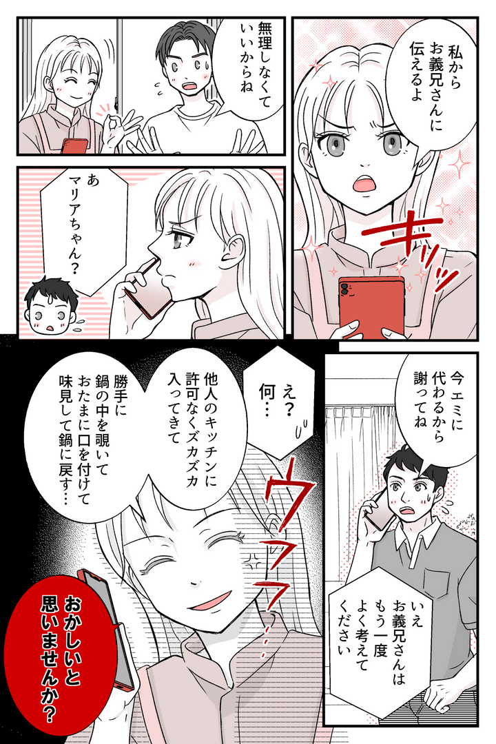 私はマリア(30代)。3歳の息子(サク)を育てる母で、私と夫(キョウスケ、30代)は共働きです。休日に私が夕飯のカレーを作っていると、義兄(ケンタ、30代)の妻(エミ、30代)が突然わが家にやってきました。しかもエミさんはキッチンに置いていた夕飯のカレーを勝手に味見して、口を付けたおたまをそのまま鍋に戻したのです! 私たち夫婦はエミさんの行動を非常識だと感じて咎めますが、義兄夫婦はまるでエミさんが被害者かのように振る舞います。