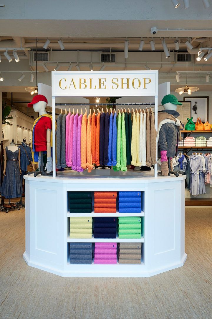 注目は、入店してすぐ目に飛び込んでくるカラフルな「ケーブル ショップ」。カラーバリエーション豊富なケーブルニットやカーディガン、今シーズンの新作であるケーブル編みのボンバージャケットやベスト、グローブ、バラクラバなどのアクセサリーまで、幅広いアイテムがラインナップ。その他にも、プレッピーな要素が散りばめられたプレイフルなエクスクルーシブアイテムもお目見え