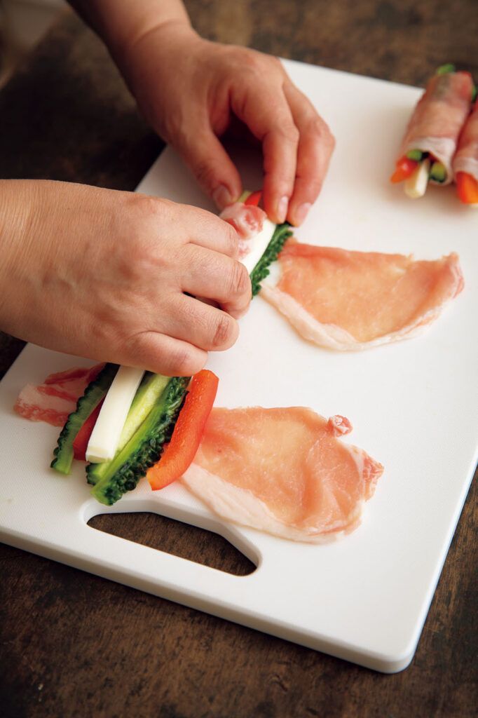豚肉で具を巻く 豚肉1枚を縦長に広げ、ゴーヤーとパプリカの各1/8量、チーズ1切れを手前に横長にのせ、くるくると巻く。残りも同様に作る。