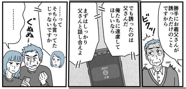 義父にはこれで、義兄との仲の悪さもバレたでしょう。けれど今後の親戚関係がどうなろうが、もうどうでもいいです。義兄の言動をひたすら「仕方ない」で片付けてきた義家族たち、そして夫の言うことに盲目的に従うリエさんにも問題があります。全員まとめて目を覚ましてもらいたいと思います!