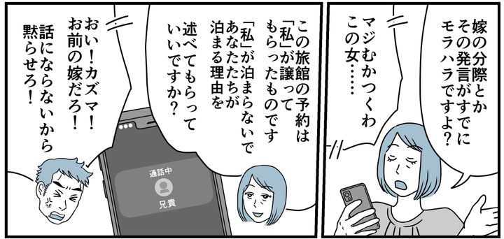 私(アユミ)は、夫のカズマと3人の子どもたちと暮らしています。夫は3人きょうだいの真ん中で、兄と妹がいます。私は横暴な義兄コウスケさんとその妻のリエさんが嫌で、徹底的に避けてきました。しかし有名旅館への宿泊に義両親を招待しようとしたところ、義父が他のきょうだいまで誘ってしまいます。別のホテルしか取れなかった義兄が私たちに「部屋を交換しろ」と言い出し、義両親もなぜかそれをすんなり受け入れ……。ついに私はブチ切れました!
