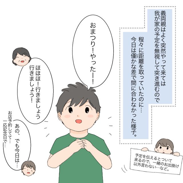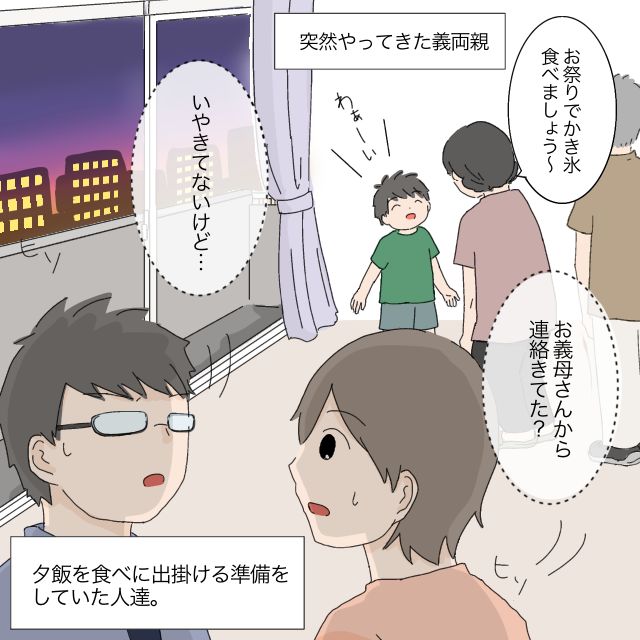 この日は夫婦の記念日だったので、夕飯に出かけようとしていました。すると「陽くん!結ちゃん!お祭り行きましょう!」と、アポなしでやってきた義両親。