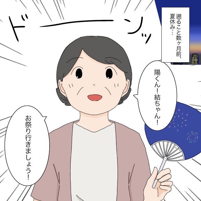 一方、「お祭り!やったー」と陽が喜ぶので気をよくした義母が「ほほほ!行きましょう行きましょう!」と、夫の「でも今日はお店予約してて、一応記念日で・・・」という声など届くはずもなく、ノリノリです。