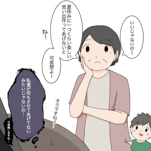 息子が喜ぶならまだ我慢できたのですが、「いいじゃないの~。夏休みに一つくらい楽しい思い出作ってあげないと可哀そうよ」と、まるで私たちが何もさせてあげていないみたいなことを真顔で言われてしまいました。苛立ちを押さえつつ、「そうですねぇ。今準備しますね。」とかろうじて返事をしました。