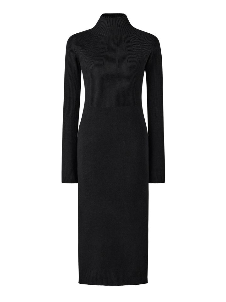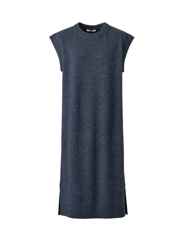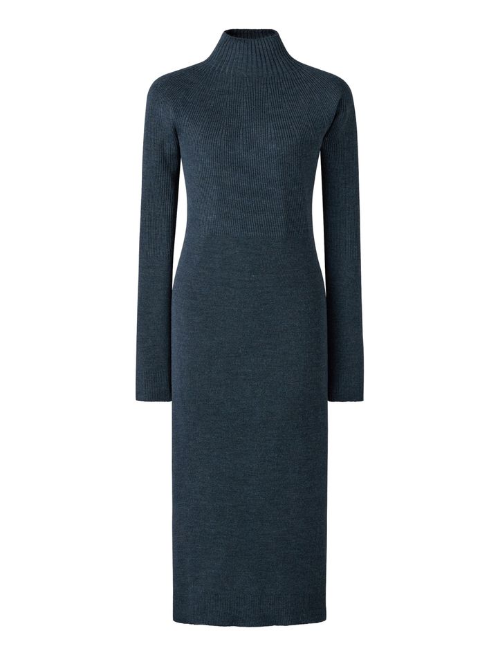 もう1型は、ステッチバリエーションが特徴的なモックネックの長袖ワンピース。上質なメリノブレンドをリブ編みにした「3Dニット」で、ほどよいフィット感が着心地のいい一枚。こちらはブラックとブルーのカラーバリエ。