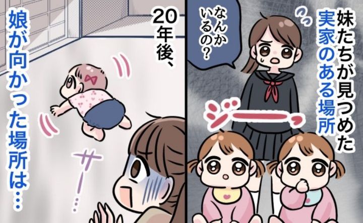 それから20年以上が経ったある日、私はハイハイできるようになった娘を連れて実家に帰省しました。すると、昔妹たちがよく見つめていた場所に娘がハイハイしていき、何もないその場所に向かって手を振ったのです……。