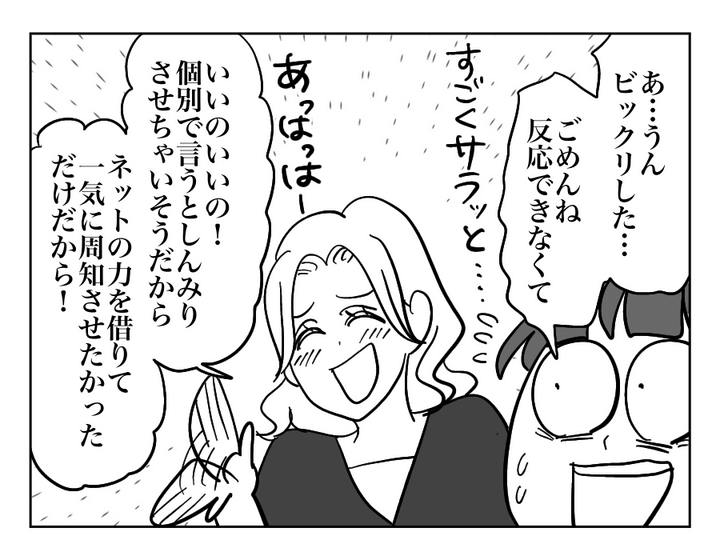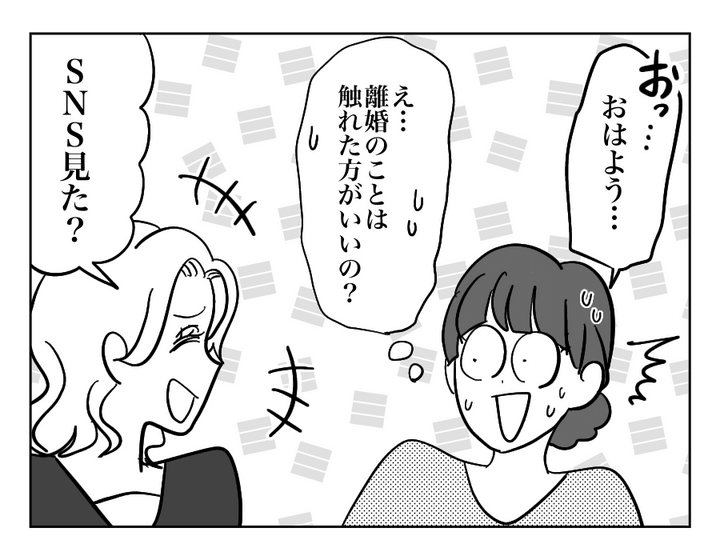 SNSでの離婚報告から数日後。リアルにミサさんと会ったときに、しっかりと離婚報告をしてもらったユキノさん。SNSで離婚報告をした理由もわかって、これにて一件落着? かと思いきや、ユキノさんはまだモヤモヤしています。ミサさんとは「これまでどおり」でいられるはずなのに、ミサさんの言動のなにかが引っかかっているようですね。