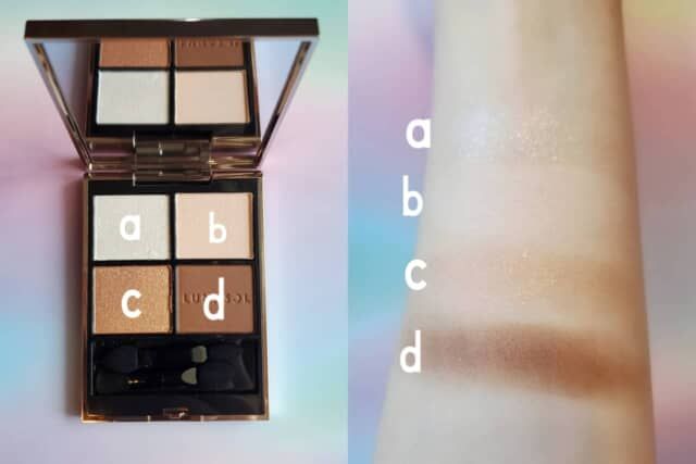 aは大小のパールを絶妙なバランスで配合したクリアラメ。濡れたようなツヤを放ち、瞬きするたび繊細に輝きます。b〜dは肌なじみのよいニュートラルトーンで構成されており、単色でも重ねてもにごらず、立体的なグラデーションが完成。オフィスでは控えめに、夜はラメを効かせて華やかにと、シーンを選ばない万能さも魅力です。粉質はなめらかで密着度が高く、メイク初心者でも上級者のような洗練された目元印象を叶えます。