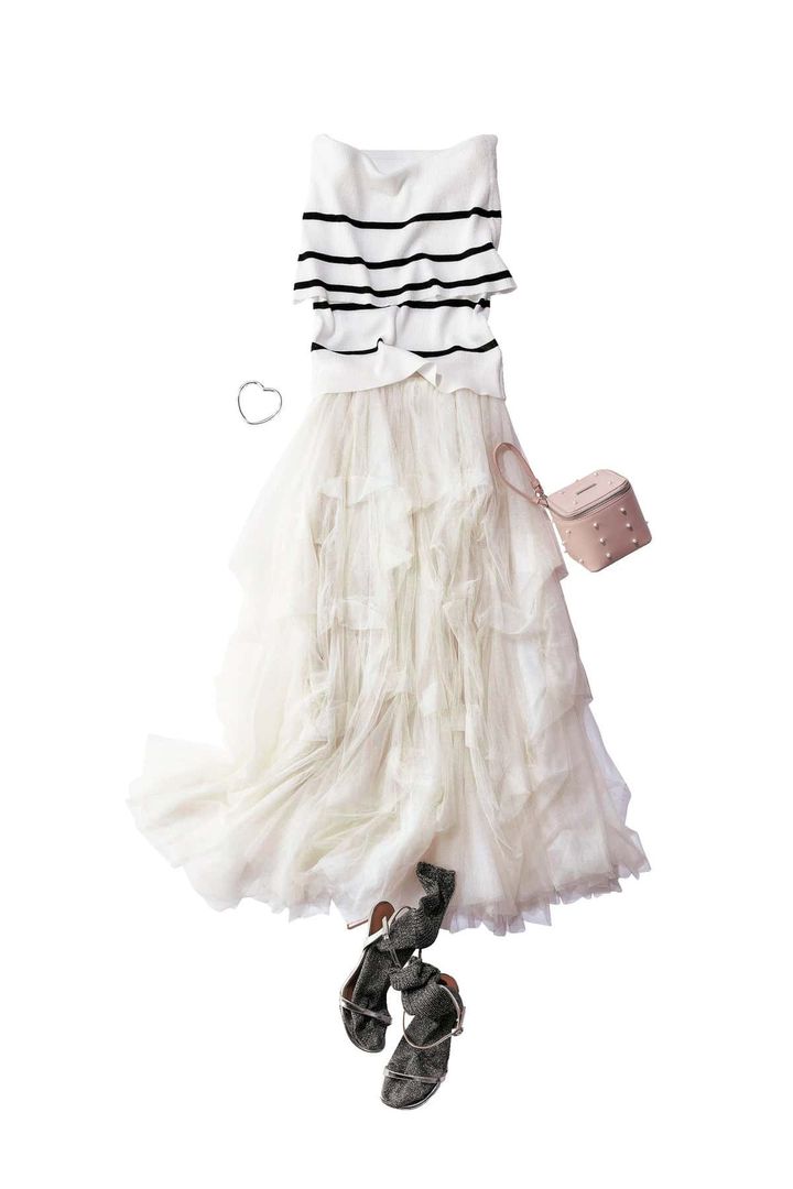 華やかさを保ちつつ、モノトーンコーデにすることで上品な雰囲気に。印象的な形のハンドバッグが差し色になって◎。リングやピアス、ブレスレッドなどのアクセサリーで煌めきを重ねて。