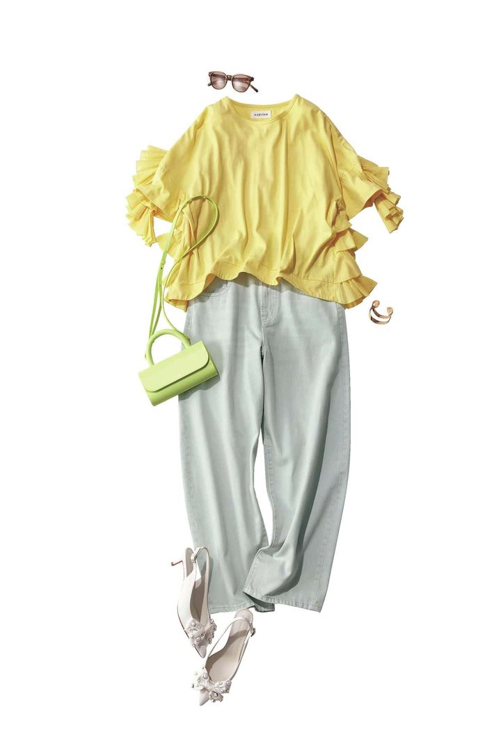 カットソー¥24,200 (アユーシ/エヌディシージャパン東京オフィス)デニムパンツ¥20,800 (アルベージュストーリーオリジナル) バッグ¥78,100 (サルチェ/フラッパーズ) パンプス¥32,900 (ツル バイ マリコオイカワ) サングラス¥47,300 (アイヴァン/アイヴアン東京ギャラリー) バングル¥4,400 (アビステ)