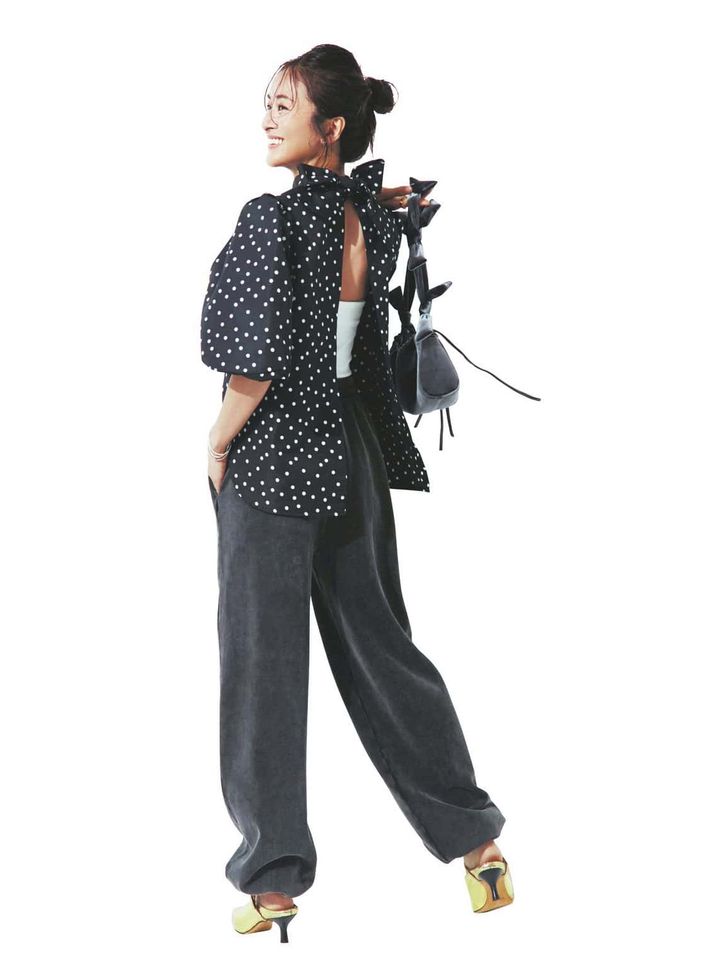 チャーミングなドットブラウスは背中を開けることでヘルシーな雰囲気もプラス。スウェットを合わせてカジュアル要素も入れつつ、イエローのピンヒールがコーデの差し色になって夏らしさも感じれるコーデに。