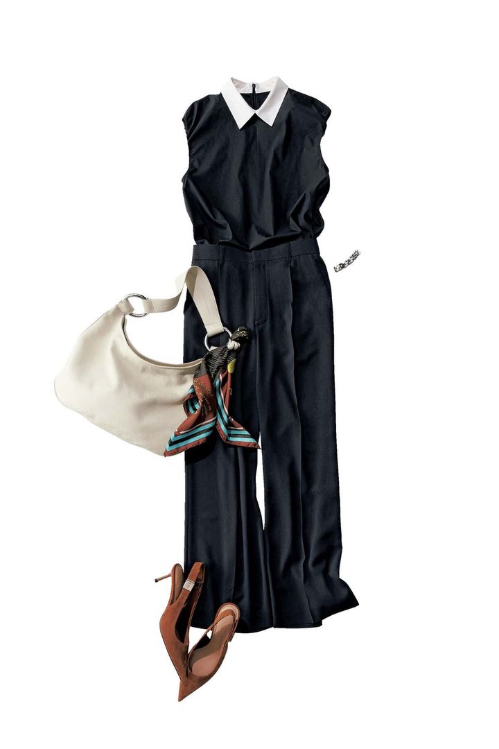 シアーブラウス¥24,200(Charmante Femme/Charmant Sac)ノースリーブブラウス¥27,500パンツ¥38,500(ともにダブルスタンダードクロージング/フィルム)バッグ¥198,000(ボナベンチュラ/ボナベンチュラ カスタマーサポート)フラットシューズ¥28,600(ツル バイ マリコ オイカワ)バングル¥24,200(ワンエーアールバイウノアエレ/ウノアエレ ジャパン)