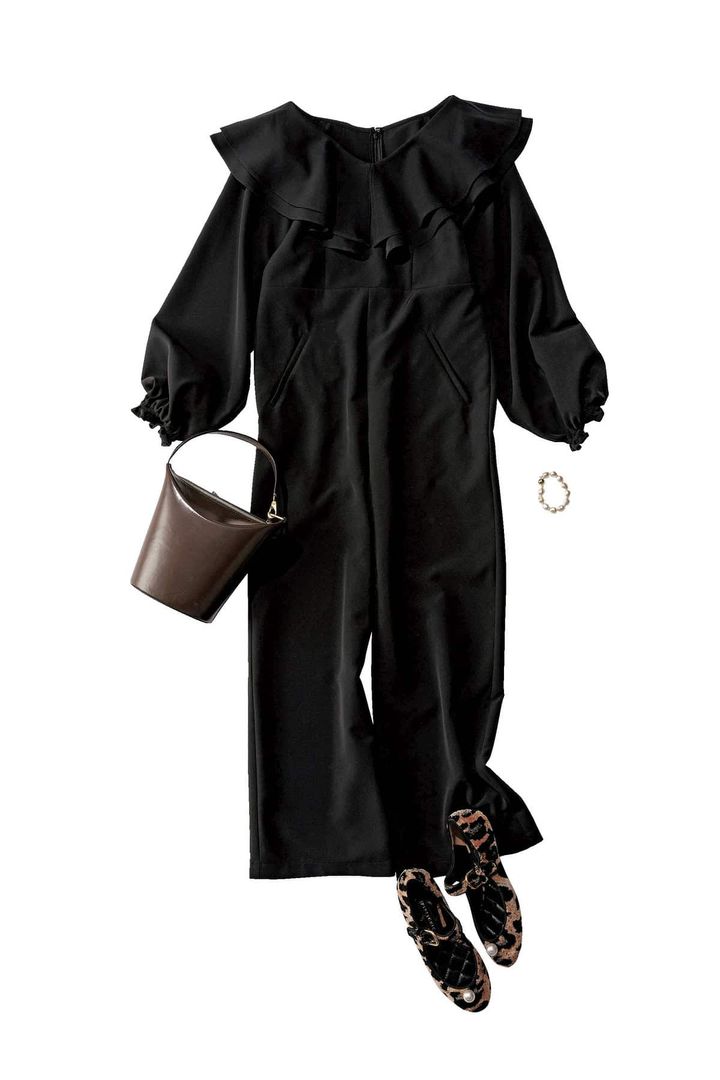 シンプルかつ実用的なファッションを好むため1着で完結するうえにこなれ感も纏えるオールインワンが好相性。地味見え回避には小物でさりげなく遊びをプラスして。