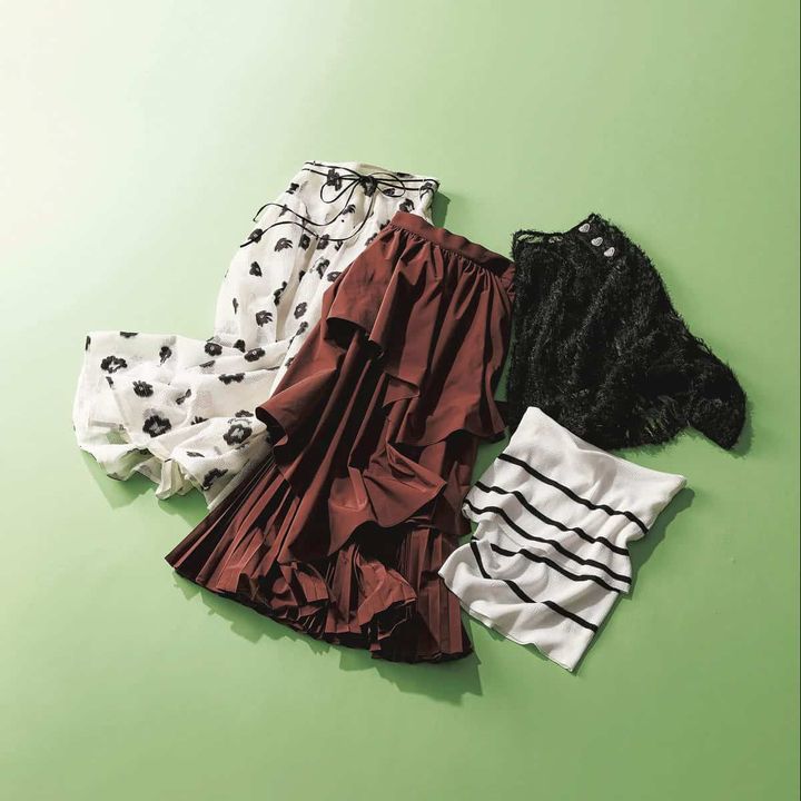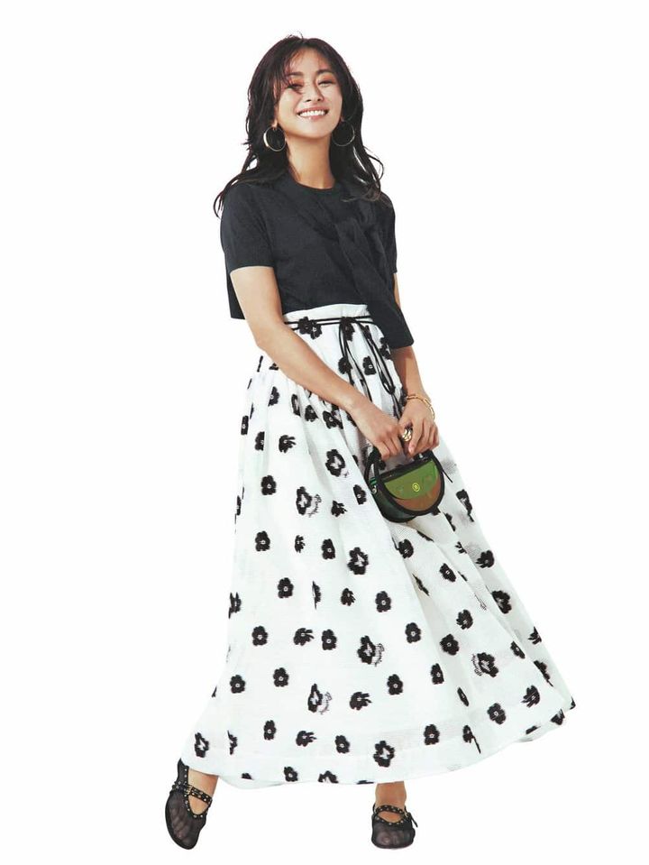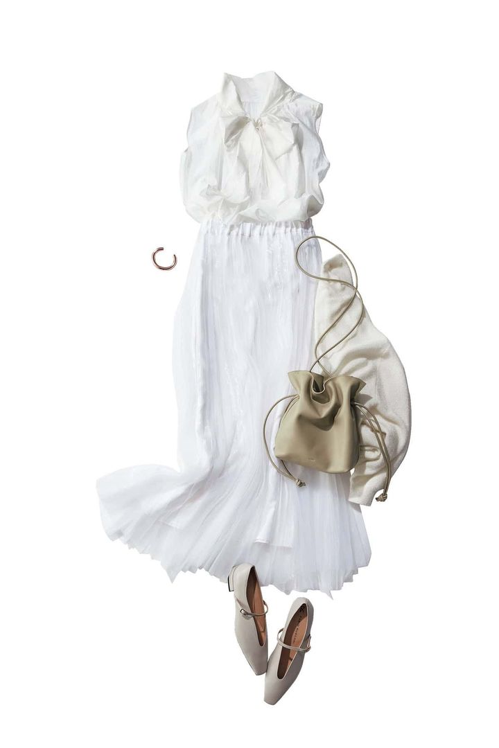 スカート¥28,500(シーニュ)ブラウス ¥18,700 (エミ/エミニュウマン新宿店) バッグ¥6,930 (カシュカシュ/アンビリオン) フラットシューズ¥46,200 (PIPPICHIC/・ベイジュ) ブレスレット¥37,400(ワンエーアールバイウノアエレ・ウノアエレレジャパン)