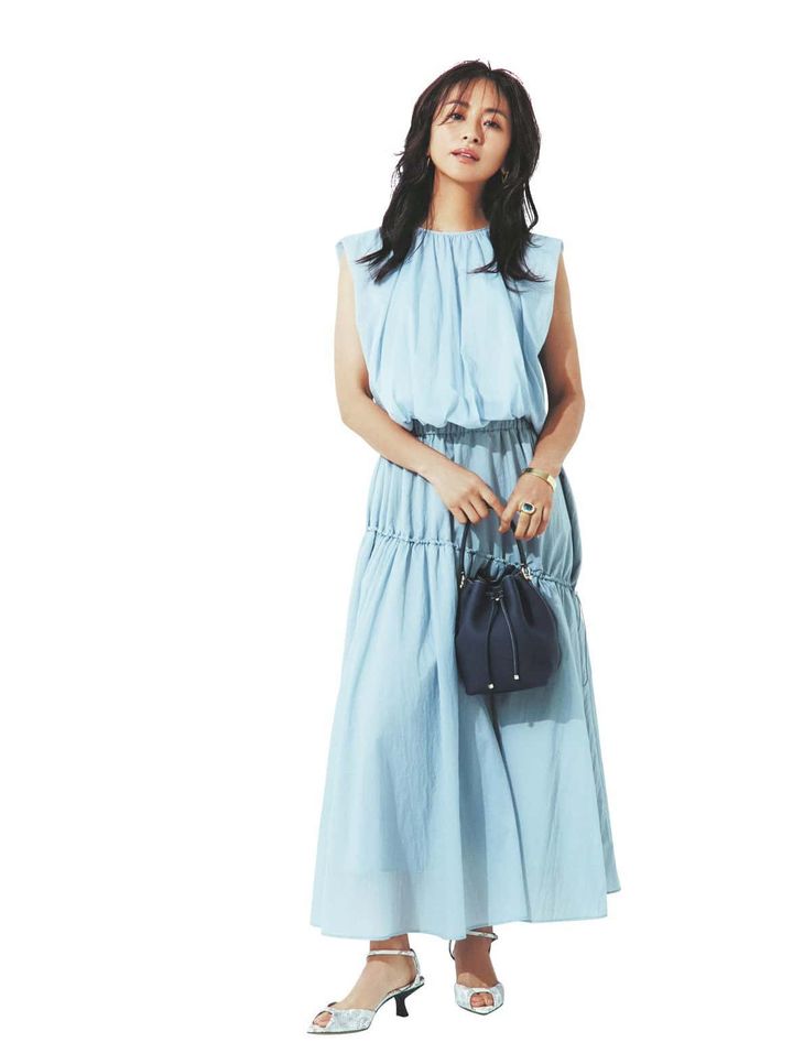 爽やかなトーンのスカイブルーが気分を涼しくしてくれます。サラッとした素材は寒色との相性も良くて◎。紺色のバッグがコーデ全体を引き締めれくれます。