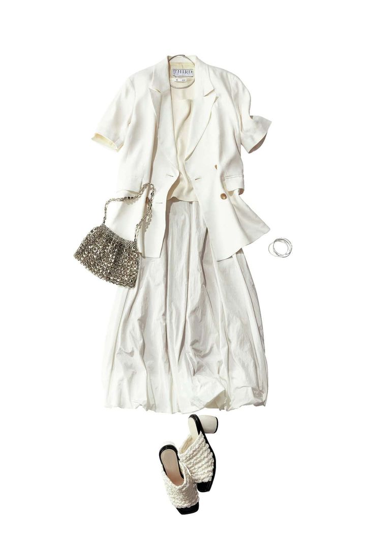 ホワイトを基調としたなどの柔らかいカラーにすることで爽やかな印象に!ホワイト×バルーンのスカートやサラッとしたジャケットなどさまざまな質感のアイテムをコーデに組み合わせることでカラーで統一感を出しながら、飽きさせないような遊び心のあるコーデになります。