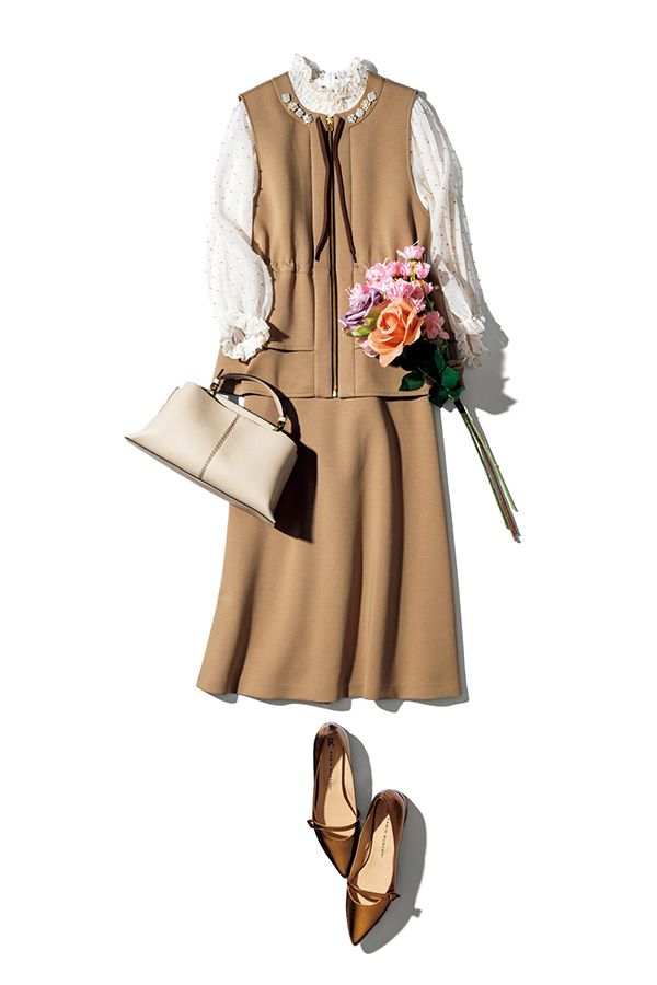 ジレ¥35,200、ブラウス¥35,200、スカート¥33,000/以上エム マーリエ ル カセット、バッグ¥46,200/LORISTELLA、パンプス¥38,500/FABIO RUS CONI(以上フランドルカスタマーサービス)