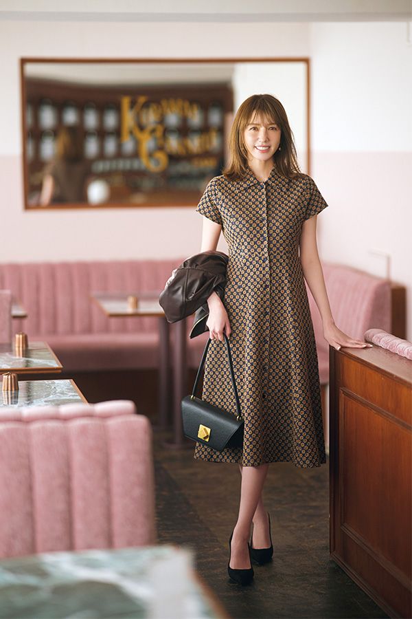 ジャケット¥121,000、ワンピース¥49,500/ともにエム マーリエ ル カセット、バッグ¥68,200/ARCADIA、ピアス、パンプス[ともに参考商品](以上フランドルカスタマーサービス)