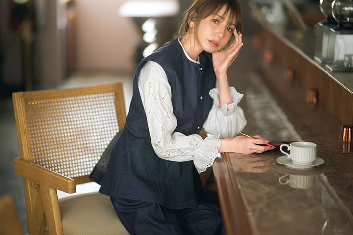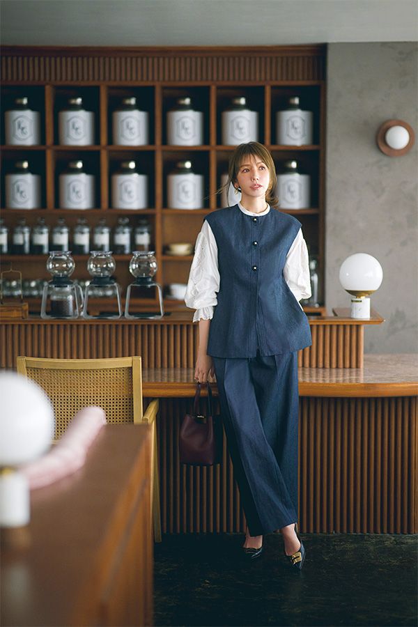 心ほどけるソロタイムに選びたいのはさっと纏える、ジレとパンツの軽やかコンビ。デニムのやわらかな風合いにも癒されます。