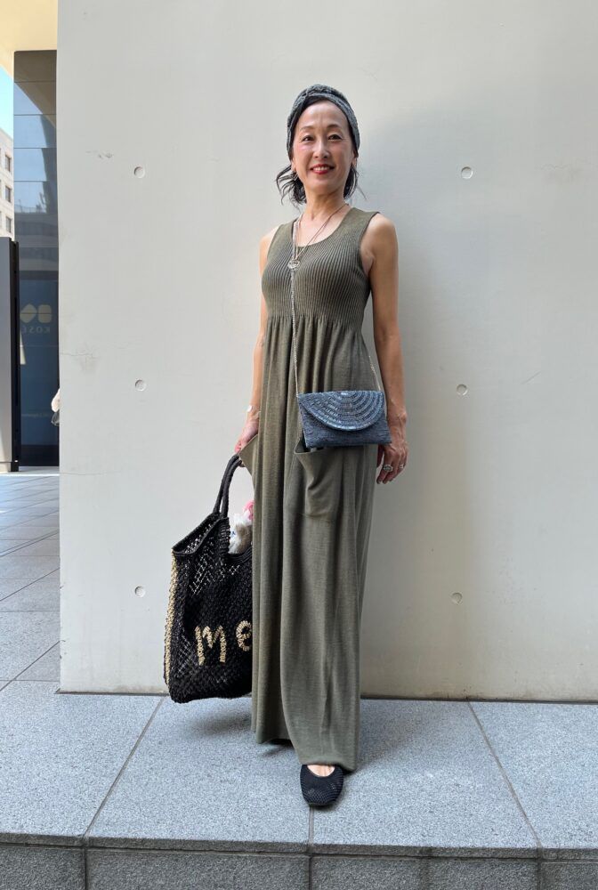 素敵なあの人のイベントに参加をされた鈴木さん。「暑さに耐えられずノースリーブワンピースを着ましたが、立秋を過ぎたので色をダークに。茶系が流行っているので、カーキのワンピースを選びました。一年を通してワンピースが多め。一枚で決まるのがいいですよね」。暑さの中でも、カラーを秋色にすることで季節を感じるスタイルに。
