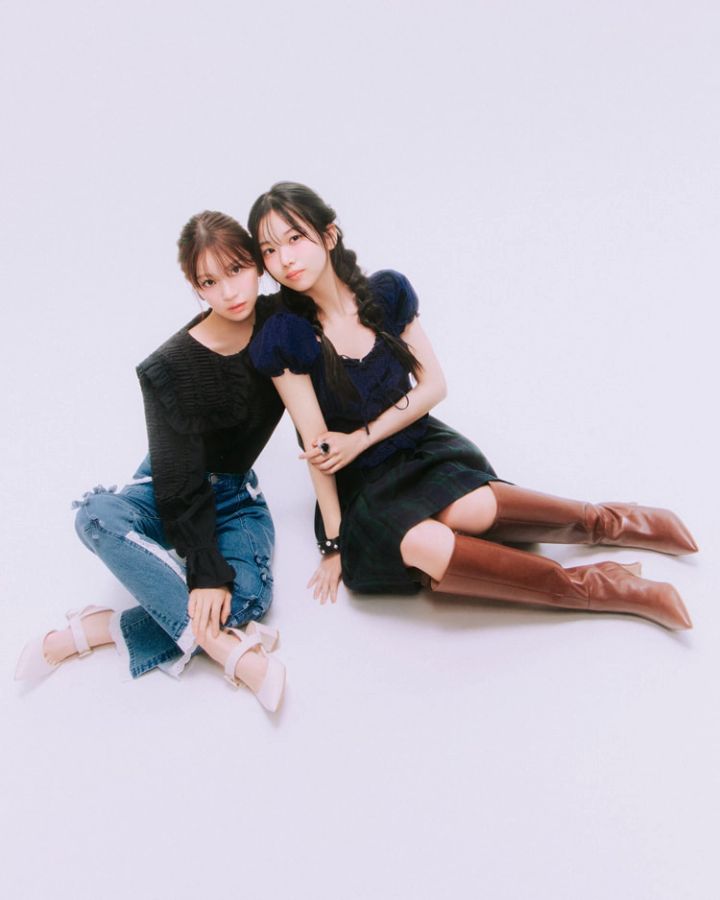 〈右・琉〉ブラウンロングブーツ 42,350円/ダイアナ(ダイアナ 銀座本店)ネイビーリボンブラウス 5,940円/OLIVE des OLIVE チェック柄スカート 21,000円/CRANK、バッグ 8,520円/mucu and ebony(ともにHANA KOREA)リング 660円/ラティス バングル 24,150円/アビステ〈左・紅葉〉白パンプス 17,050円/ダイアナ(ダイアナ 銀座本店)フリルブラウス 9,350円、リボンデニムパンツ 13,200円/ともにmerry jenny