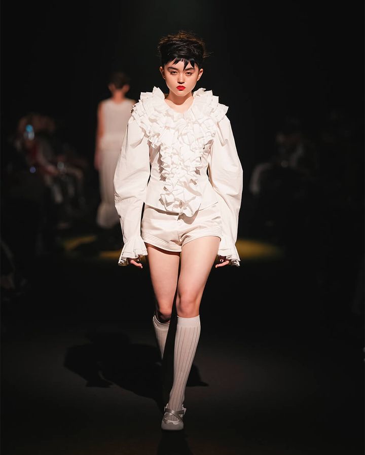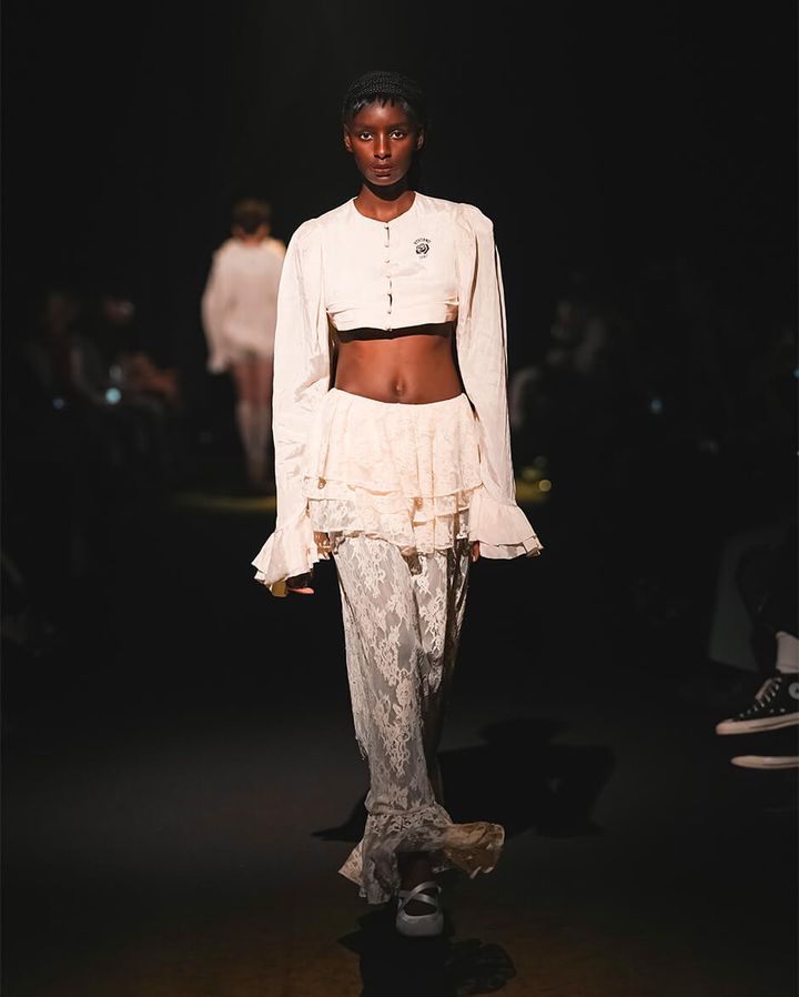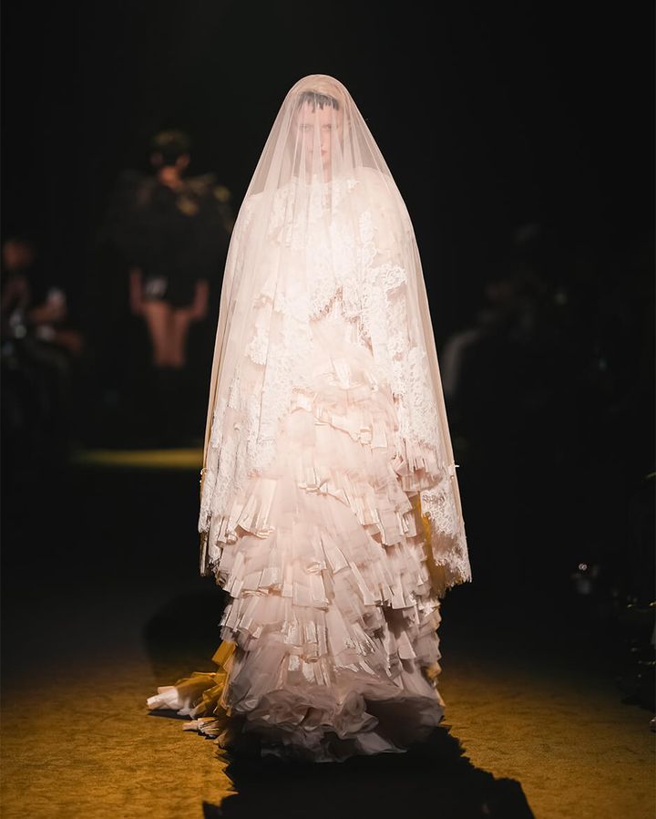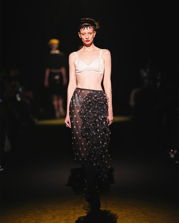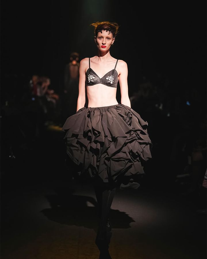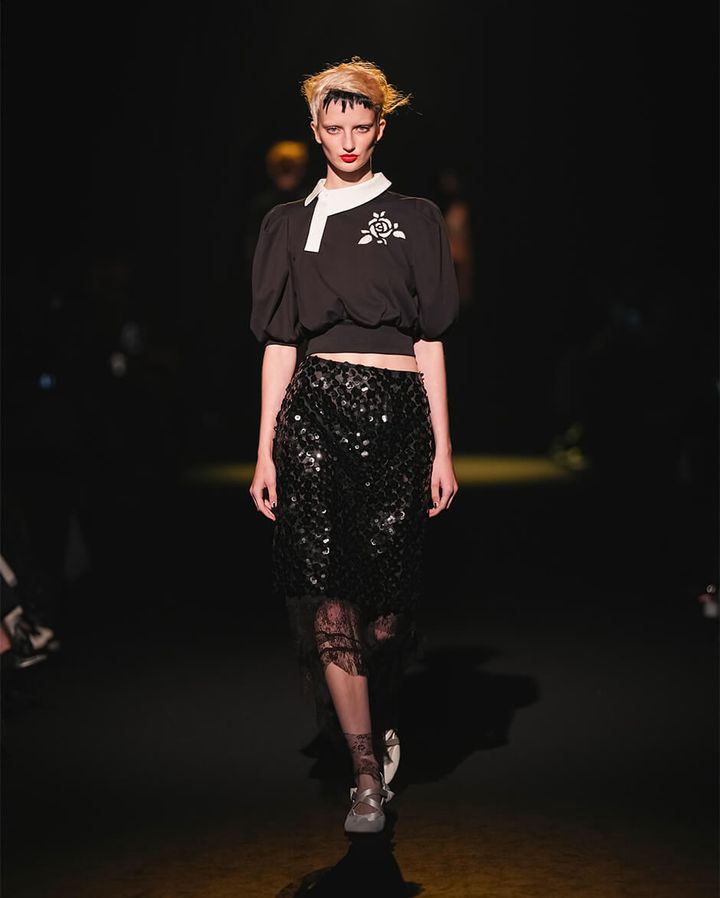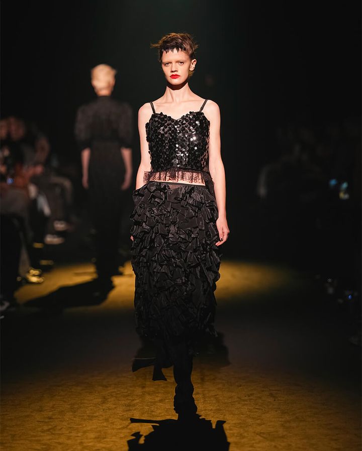 そのアプローチにより、クチュールライクな構築や刺繍のひと針、ラッフルの揺らぎといったブランド独⾃のディテールがより鮮明に浮かび上がった。