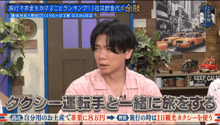 旅好き芸人たちがそれぞれの旅の流儀を語る中で、「僕は車持ってないので交通費に(お金を)かける。(最近)タクシーめっちゃいいなっていうことに気づいて」と話し始めた野田。今では1日観光タクシーを使い、「タクシー運転手と一緒に旅をしている」という。ちなみに観光タクシーは「高いけれども、それだけに金を使ってると思えば、そんな大した額じゃない」と感じているそうで、熊本に行った時は1日貸し切って「5万円もいかなかった」のだとか。