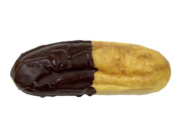 シュー生地を絞り、ふんわりしっとりと焼き上げたパン生地に、カスタードクリームをサンドしました。チョコレートを半掛けすることで、2種類の味を楽しめる菓子パンです。