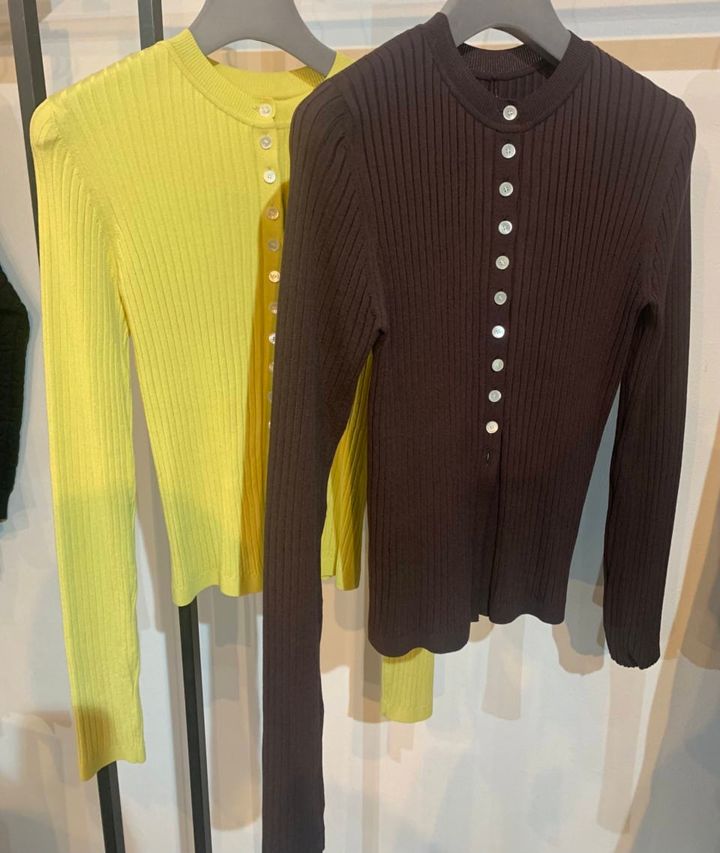「晩夏にも使えるドライタッチなラッピンノットのニットは、ボタンディテールのバランスが凝っている1枚。コーデ全体がバランスよく決まるのでお気に入りです」ニット各¥39,600(共にラッピンノット/ウメダニット)