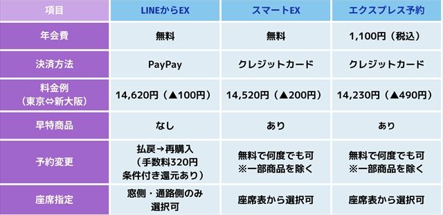 スマートEXやエクスプレス予約と比較すると、料金(割引率)や予約変更、座席指定などに違いがあります。
