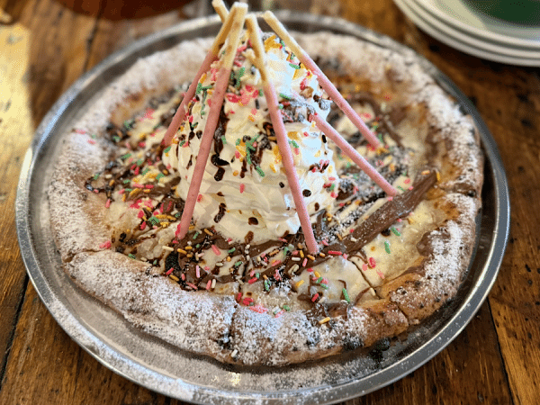 ヌテラをたっぷり塗った生地に、バニラアイスや生クリーム、ポッキーやカラースプレーをトッピングしたデザートピッツァは大人気! 子どもも大人も大満足の一品でした。 期間限定の「しらすとしょうがのピザ」はさっぱりとした味わいで、季節を感じられてとても美味しかったです。