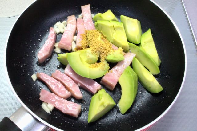3. アボカドとコンソメを加えて炒め、塩と黒こしょうで味を調えます。